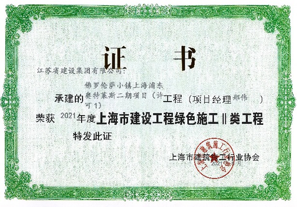 佛羅倫薩小鎮(zhèn)項(xiàng)目獲得上海市綠色施工II類工程獎(jiǎng)