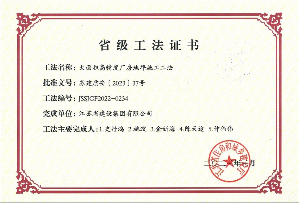 大面積高精度廠房地坪施工工法——省級(jí)工法證書(shū)