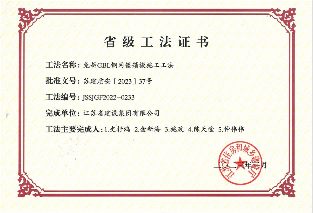 免拆GBL鋼網(wǎng)鏤箱模施工工法——省級(jí)工法證書(shū)