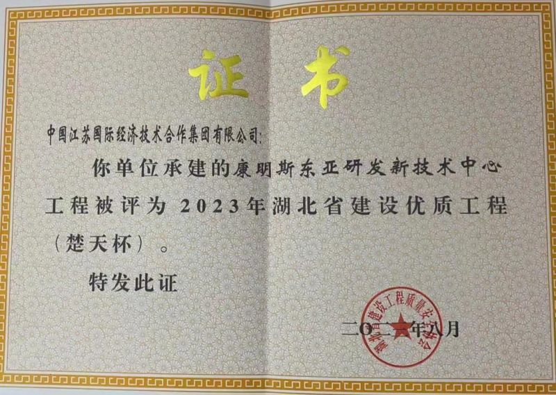 康明斯東亞研發(fā)新技術(shù)中心工程獲得湖北省建設(shè)優(yōu)質(zhì)工程(楚天杯)